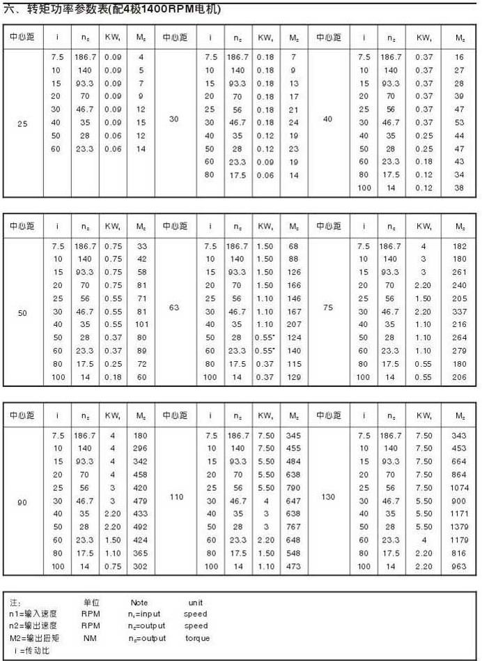 轉(zhuǎn)矩功率參數(shù)表(配4級1400RPM電機)